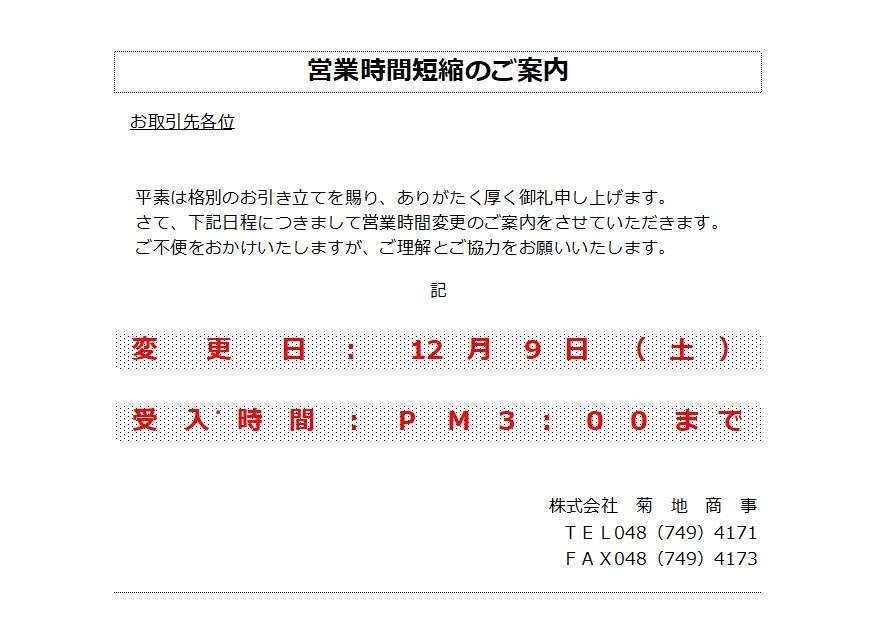 誠に勝手ながら12月9日(土)の営業時間を下記のとおり変更させていただきます。